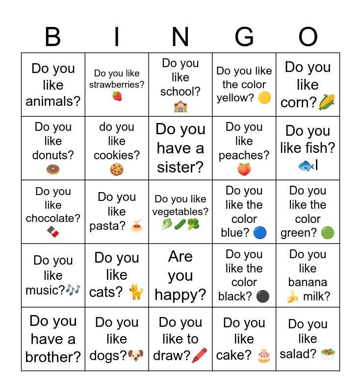 This bingo card has a free space and 24 words: Do you like cats? 🐈, Do you like dogs?🐶, Do you have a sister?, Do you have a brother?, Do you like corn?🌽, Do you like animals?, Do you like donuts? 🍩, Do you like strawberries?🍓, Do you like the color blue? 🔵, Are you happy?, Do you like peaches? 🍑, Do you like chocolate? 🍫, Do you like the color black? ⚫️, Do you like banana 🍌 milk?, do you like cookies? 🍪, Do you like cake? 🎂, Do you like the color green? 🟢, Do you like school? 🏫, Do you like fish? 🐟I, Do you like pasta? 🍝, Do you like salad? 🥗, Do you like music?🎶, Do you like the color yellow? 🟡 and Do you like to draw?🖍.