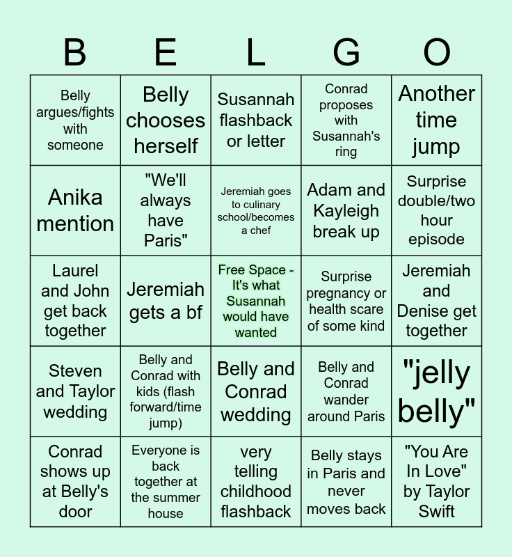 This bingo card has a free space and 34 words: "This Love" by Taylor Swift, Belly stays in Paris and never moves back, "Lover" by Taylor Swift, Conrad brings Belly candy, Steven and Taylor wedding, "We'll always have Paris", Another time jump, Conrad shows up at Belly's door, Belly chooses herself, Belly wears the infinity necklace again, Jeremiah goes to culinary school/becomes a chef, Susannah flashback or letter, At least 3 Taylor Swift Songs, Belly and Benito have a low-drama breakup, Surprise pregnancy or health scare of some kind, Surprise double/two hour episode, Everyone is back together at the summer house, Laurel and John get back together, Belly and Conrad with kids (flash forward/time jump), Belly and Conrad wander around Paris, Belly and Conrad wedding, voiceover about how hair holds memories, Belly argues/fights with someone, Jeremiah and Denise get together, very telling childhood flashback, "You Are In Love" by Taylor Swift, Conrad proposes with Susannah's ring, Cam Cameron Cameo, Adam and Kayleigh break up, Anika mention, Adam and Laurel get together, Jeremiah gets a bf, "jelly belly" and "Paris" by Taylor Swift.
