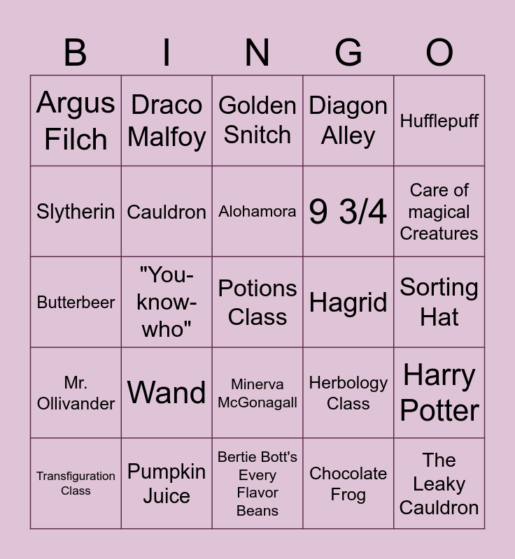 This bingo card has 65 words: Free, Hedwig, Hogwarts Express, Harry Potter, Hermoine Granger, Ron Weasley, Draco Malfoy, Wingardium Leviosa, Alohamora, "The boy who lived", Minerva McGonagall, Gryffindor, Sorting Hat, Hufflepuff, Ravenclaw, Slytherin, "You-know-who", Argus Filch, Broomstick, 9 3/4, Wand, Mr. Ollivander, Diagon Alley, Gringotts bank, Lumos, Nox, Accio, Severus Snape, Potions Class, Charms Class, Transfiguration Class, Great Hall, Neville Longbottom, Common Rooms, Herbology Class, Pumpkin Juice, The Fat Lady, Butterbeer, Chocolate Frog, Treacle Tart, Cauldron, Fang, Hagrid, Forbidden Forest, Quill & Parchment, Robes, Care of magical Creatures, Crabbe and Goyle, The Leaky Cauldron, Ministry of Magic, Invisibility Cloak, Locomotor Mortis, Defense Against the Dark Arts, Bertie Bott's Every Flavor Beans, Petrificus Totalus, Snake, Albus Dumbledore, Golden Snitch, Bludger, Quaffle, Quidditch, Badger, Eagle, Loin and Owl Post.