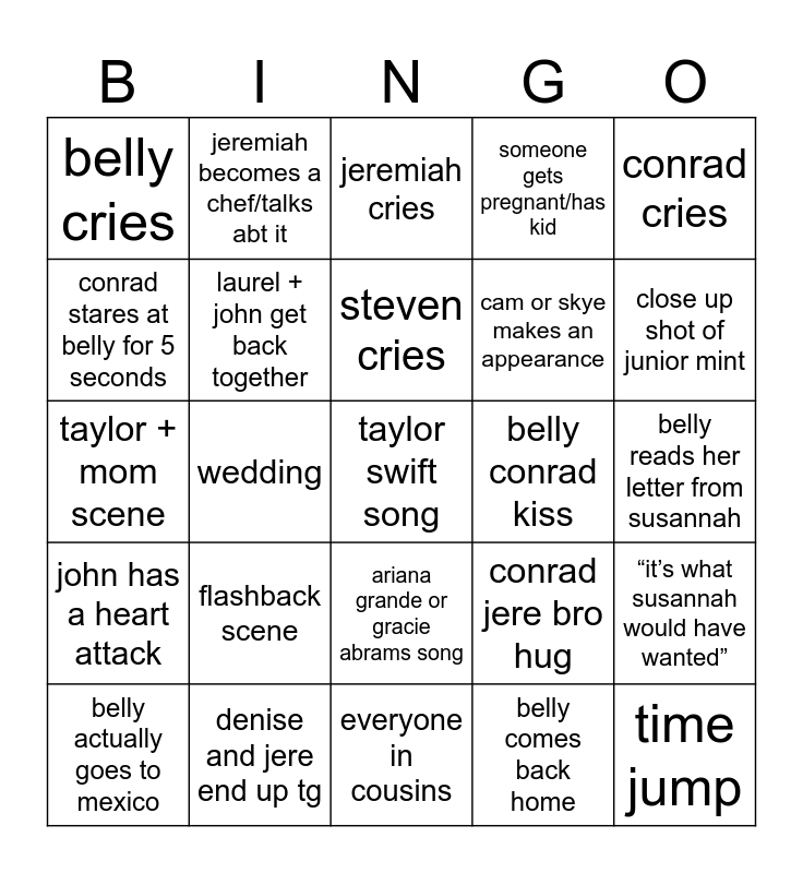 This bingo card has a free space and 24 words: flashback scene, denise and jere end up tg, steven cries, belly actually goes to mexico, conrad cries, belly cries, conrad stares at belly for 5 seconds, jeremiah becomes a chef/talks abt it, belly conrad kiss, ariana grande or gracie abrams song, cam or skye makes an appearance, taylor + mom scene, conrad jere bro hug, “it’s what susannah would have wanted”, laurel + john get back together, belly comes back home, belly reads her letter from susannah, jeremiah cries, close up shot of junior mint, wedding, time jump, john has a heart attack, someone gets pregnant/has kid and everyone in cousins.