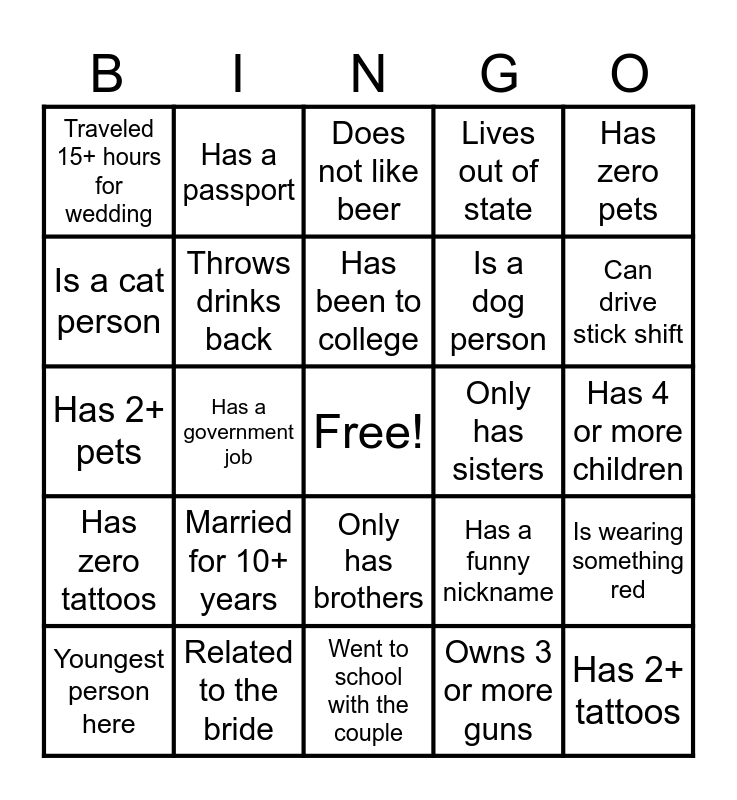 This bingo card has a free space and 30 words: Related to the bride, Related to the groom, Has a government job, Is a veteran, Traveled 15+ hours for wedding, Does not like beer, Throws drinks back, Only has brothers, Only has sisters, Went to school with the couple, Has 4 or more children, Has 2+ tattoos, Owns 3 or more guns, Has been out of the country, Can drive stick shift, Is left handed, Has a funny nickname, Has zero tattoos, Married for 10+ years, Has zero pets, Has 2+ pets, Lives in the state, Has a passport, Is a dog person, Is a cat person, Lives out of state, Is wearing something red, Youngest person here, Has been to college and Is a firefighter.