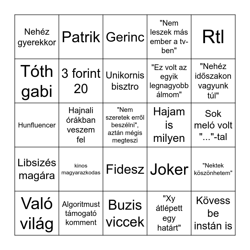 This bingo card has 25 words: kinos magyarazkodas, Buzis viccek, Unikornis bisztro, Való világ, Rtl, Nehéz gyerekkor, Tóth gabi, Patrik, Hajam is milyen, Fidesz, "Ez volt az egyik legnagyobb álmom", Hunfluencer, Joker, "Nektek köszönhetem", 3 forint 20, Kövess be instán is, Sok meló volt "..."-tal, Gerinc, "Nehéz időszakon vagyunk túl", Hajnali órákban veszem fel, "Nem szeretek erről beszélni", aztán mégis megteszi, Algoritmust támogató komment, Libsizés magára, "Nem leszek más ember a tv-ben" and "Xy átlépett egy határt".