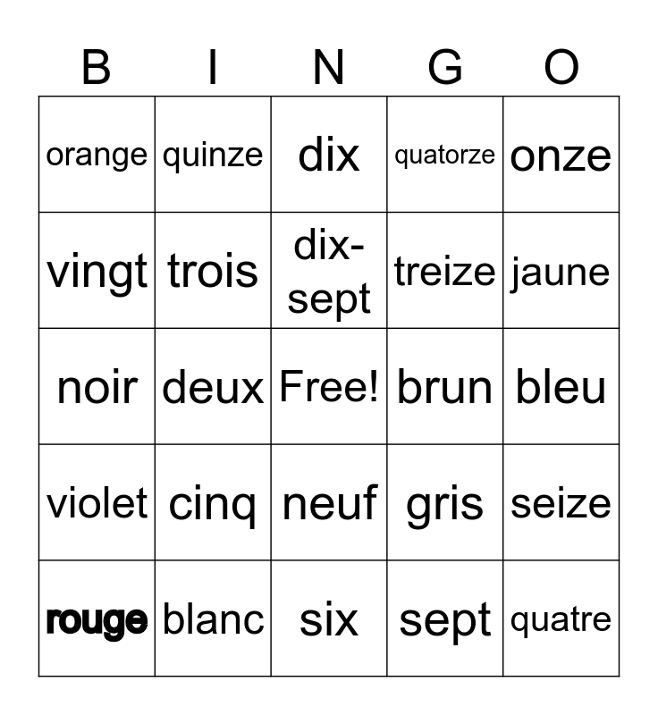 This bingo card has a free space and 29 words: rouge, un, deux, vert, orange, dix, trois, cinq, brun, blanc, bleu, quatre, six, sept, jaune, huit, neuf, violet, onze, noir, gris, douze, treize, vingt, quatorze, quinze, seize, dix-sept and dix-huit.