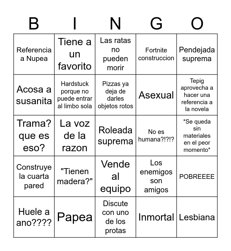 This bingo card has a free space and 24 words: Huele a ano????, "Tienen madera?", Pizzas ya deja de darles objetos rotos, Inmortal, Pendejada suprema, Referencia a Nupea, Tiene a un favorito, Las ratas no pueden morir, No es humana?!?!?, *Se queda sin materiales en el peor momento*, Trama? que es eso?, Hardstuck porque no puede entrar al limbo sola, Los enemigos son amigos, POBREEEE, Acosa a susanita, Papea, Discute con uno de los protas, Fortnite construccion, Tepig aprovecha a hacer una referencia a la novela, Construye la cuarta pared, La voz de la razon, Vende al equipo, Asexual and Lesbiana.