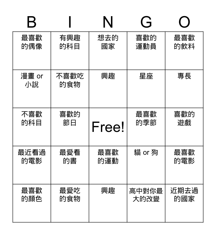 This bingo card has a free space and 24 words: 最愛看的書, 最愛吃的食物, 興趣, 最喜歡的顏色, 最喜歡的飲料, 最喜歡的偶像, 漫畫 or 小說, 有興趣的科目, 最喜歡的季節, 最喜歡的運動, 星座, 不喜歡的科目, 貓 or 狗, 最喜歡的電影, 不喜歡吃的食物, 高中對你最大的改變, 喜歡的遊戲, 想去的國家, 專長, 喜歡的節日, 近期去過的國家, 最近看過的電影, 喜歡的運動員 and 興趣.