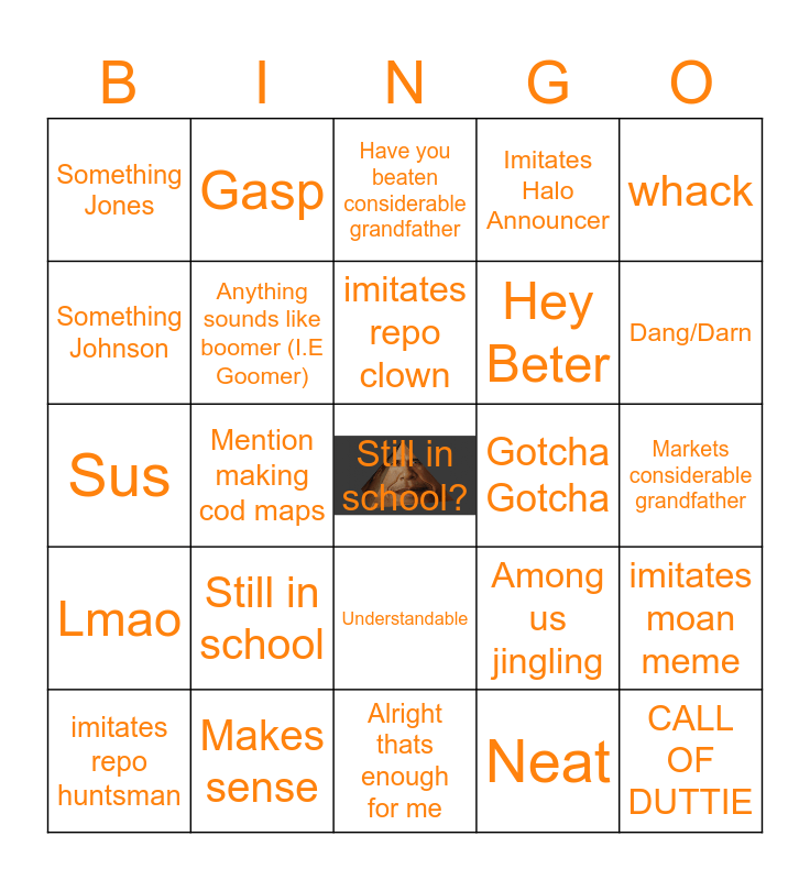 This bingo card has a free space and 25 words: Still in school, Alright thats enough for me, imitates repo clown, imitates repo huntsman, whack, Something Jones, Something Johnson, Gasp, Gotcha Gotcha, Understandable, Hey Beter, Sus, Among us jingling, imitates moan meme, Anything sounds like boomer (I.E Goomer), Late for session cause of food, Markets considerable grandfather, Have you beaten considerable grandfather, Dang/Darn, Mention making cod maps, CALL OF DUTTIE, Makes sense, Lmao, Imitates Halo Announcer and Neat.