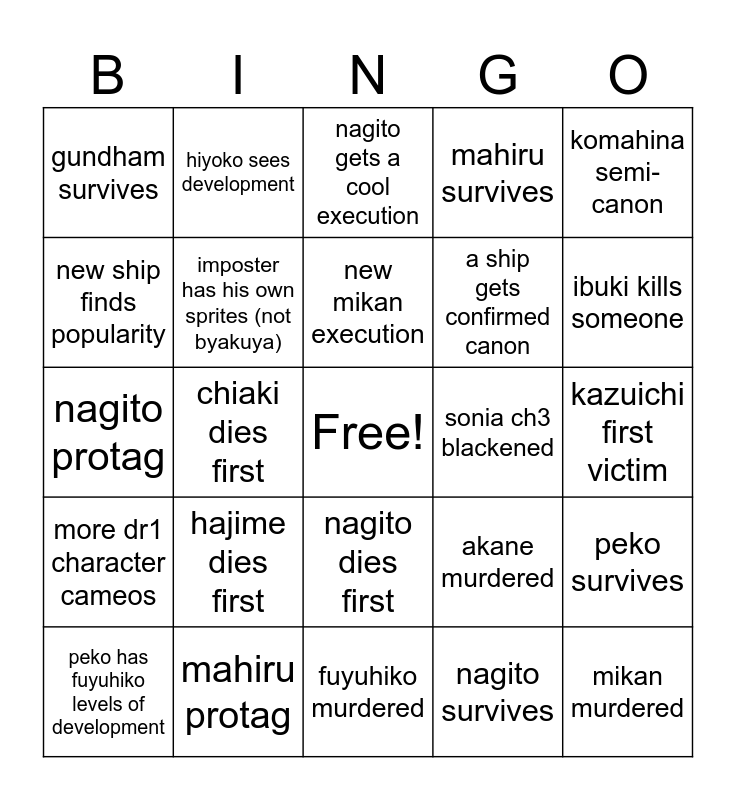 This bingo card has a free space and 24 words: hajime dies first, mahiru protag, new mikan execution, peko has fuyuhiko levels of development, komahina semi-canon, gundham survives, new ship finds popularity, hiyoko sees development, sonia ch3 blackened, nagito dies first, a ship gets confirmed canon, nagito protag, akane murdered, peko survives, imposter has his own sprites (not byakuya), nagito survives, kazuichi first victim, nagito gets a cool execution, ibuki kills someone, chiaki dies first, mikan murdered, more dr1 character cameos, mahiru survives and fuyuhiko murdered.