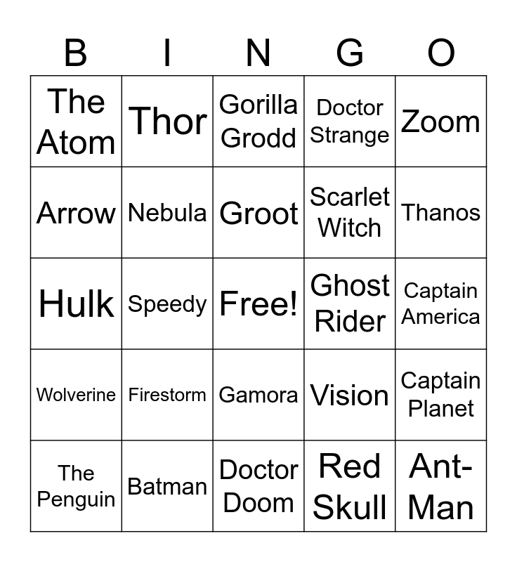 This bingo card has a free space and 68 words: Iron Man, Ant-Man, Spider-Man, Doctor Octopus, Wasp, The Hulk, Thor, Rocket, Groot, Starlord, Gamora, Captain Marvel, Captain America, Zoom, The Flash, Arrow, Speedy, The Atom, Captain Cold, Firestorm, Scarlet Witch, Vision, Wolverine, Professor X, Cyclops, Gambit, Drax, Green Goblin, Captain Planet, King Shark, Gorilla Grodd, Aquaman, Wonder Woman, Black Widow, Doctor Strange, Joker, Mr. Freeze, The Penguin, Thanos, Hulk, Hawkeye, Super Girl, Nebula, Mantis, Drax, Catwoman, Loki, Doctor Strange, Ghost Rider, Batman, Superman, Black Panther, Magneto, Doctor Doom, Two Face, Green Goblin, Red Skull, Mystique, Venom, Ultron, Quicksilver, Abomination, Penguin, Riddler, Flacon, Winter Soldier, Sandman and Mysterio.