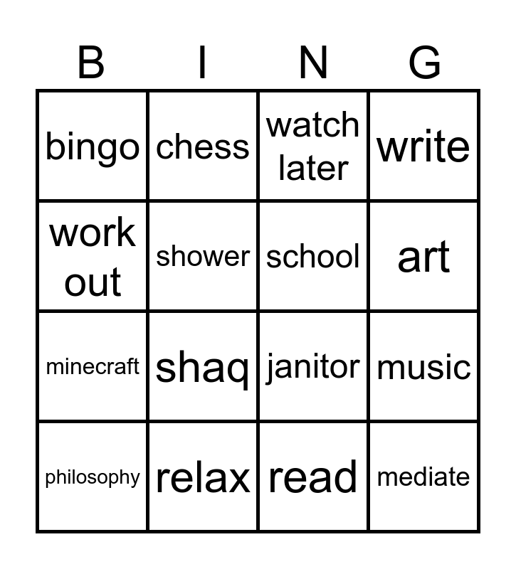 This bingo card has 16 words: relax, music, watch later, bingo, minecraft, chess, janitor, read, work out, shower, philosophy, write, shaq, art, school and mediate.