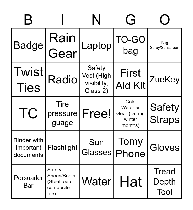 This bingo card has a free space and 24 words: Flashlight, Safety Shoes/Boots (Steel toe or composite toe), Safety Vest (High visibility, Class 2), Persuader Bar, Bug Spray/Sunscreen, Badge, Twist Ties, Rain Gear, Cold Weather Gear (During winter months), Sun Glasses, First Aid Kit, TC, Tomy Phone, Gloves, Radio, Hat, Safety Straps, Laptop, ZueKey, Tire pressure guage, Tread Depth Tool, Binder with Important documents, TO-GO bag and Water.