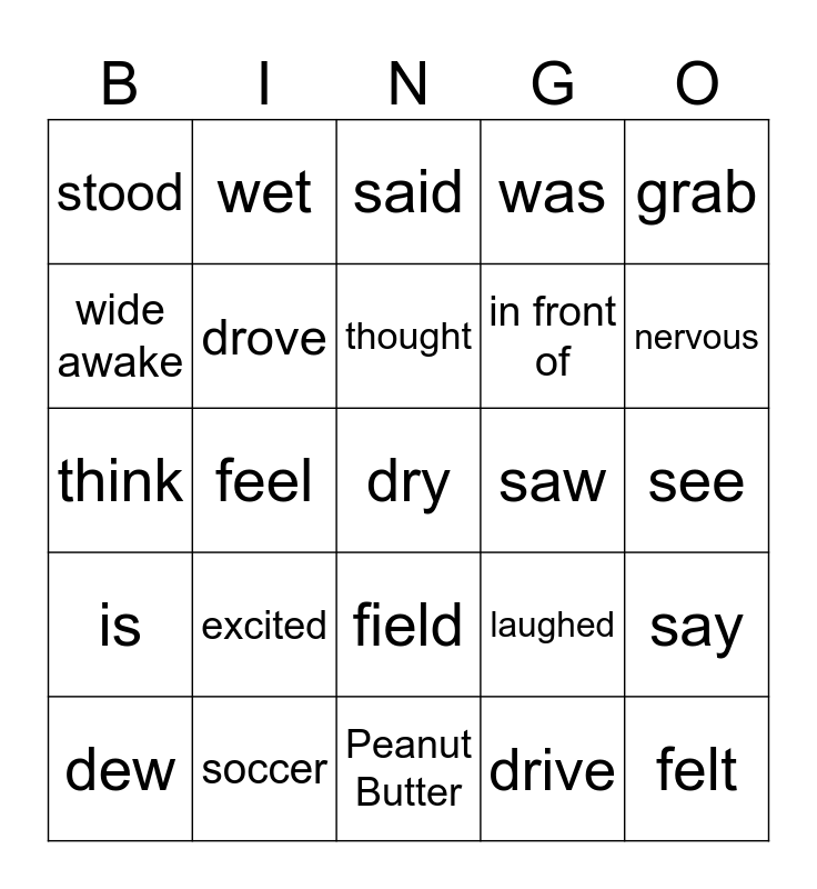 This bingo card has a free space and 24 words: excited, soccer, thought, dew, grab, stood, wide awake, wet, saw, field, in front of, think, laughed, say, drove, drive, see, said, nervous, feel, felt, is, was and Peanut Butter.