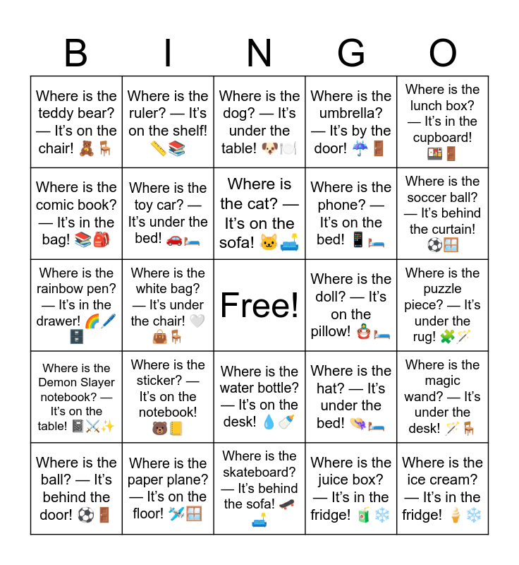 This bingo card has a free space and 33 words: Where is the pencil? โ Itโs on the desk! โ๏ธ๐ช, Where is the Chunshik tumbler? โ Itโs in the backpack! ๐ฟ๏ธ๐ฅค๐, Where is the white bag? โ Itโs under the chair! ๐ค๐๐ช, Where is the eraser? โ Itโs in the pencil case! ๐งผโ๏ธ๐ฆ, Where is the Demon Slayer notebook? โ Itโs on the table! ๐โ๏ธโจ, Where is the toy car? โ Itโs under the bed! ๐๐๏ธ, Where is the lunch box? โ Itโs in the cupboard! ๐ฑ๐ช, Where is the ball? โ Itโs behind the door! โฝ๐ช, Where is the ruler? โ Itโs on the shelf! ๐๐, Where is the candy? โ Itโs in my pocket! ๐ฌ๐, Where is the cat? โ Itโs on the sofa! ๐ฑ๐๏ธ, Where is the dog? โ Itโs under the table! ๐ถ๐ฝ๏ธ, Where is the book? โ Itโs on the window sill! ๐๐, Where is the toy robot? โ Itโs in the box! ๐ค๐ฆ, Where is the doll? โ Itโs on the pillow! ๐ช๐๏ธ, Where is the soccer ball? โ Itโs behind the curtain! โฝ๐ช, Where is the paper plane? โ Itโs on the floor! ๐ฉ๏ธ๐ช, Where is the rainbow pen? โ Itโs in the drawer! ๐๐๏ธ๐๏ธ, Where is the sticker? โ Itโs on the notebook! ๐ป๐, Where is the hat? โ Itโs under the bed! ๐๐๏ธ, Where is the water bottle? โ Itโs on the desk! ๐ง๐ผ, Where is the lunch bag? โ Itโs in the locker! ๐ฅช๐, Where is the teddy bear? โ Itโs on the chair! ๐งธ๐ช, Where is the puzzle piece? โ Itโs under the rug! ๐งฉ๐ช, Where is the skateboard? โ Itโs behind the sofa! ๐น๐๏ธ, Where is the ice cream? โ Itโs in the fridge! ๐ฆโ๏ธ, Where is the umbrella? โ Itโs by the door! โ๐ช, Where is the phone? โ Itโs on the bed! ๐ฑ๐๏ธ, Where is the comic book? โ Itโs in the bag! ๐๐, Where is the magic wand? โ Itโs under the desk! ๐ช๐ช, Where is the rainbow sock? โ Itโs on the chair! ๐งฆ๐, Where is the juice box? โ Itโs in the fridge! ๐งโ๏ธ and Where is the game console? โ Itโs on the table! ๐ฎ๐น๏ธ.