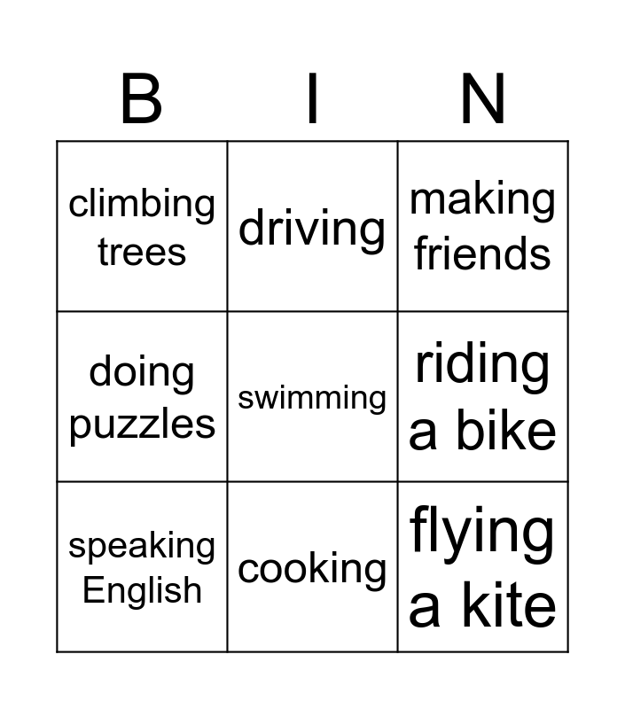 This bingo card has 11 words: flying a kite, cooking, swimming, speaking English, driving, making friends, riding a bike, snorkelling, doing puzzles, climbing trees and playing football.