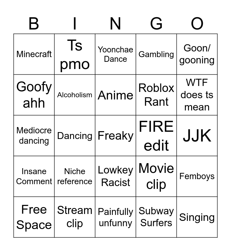 This bingo card has a free space and 49 words: Brainrot, Singing, Cooking vid, Painfully unfunny, Niche reference, Old meme, Ts pmo, Annoying, Goofy ahh, Scary asf, Alcoholism, Gambling, Femboys, Movie clip, TV show clip, Majority laughs, Anime, FIRE edit, Mentions cracking, Goon/ gooning, Dancing, Subway Surfers, Minecraft, Roblox Rant, Funny Comment, WTF does ts mean, Free Space, Skibidi Toilet, Lowkey Racist, Insane Comment, Dean x Charlie content, Charlie Kirk slander, Absolutely Insane Take, Blinding, Stream clip, CG5, Roblox, MCYT, JJK, Lowkey Homophobic, HIGHKEY Racist, HIGHKEY Homophobic, WTF just happened, White girl lip syncing, Mediocre dancing, Yoonchae Dance, FIRE dancing, Reaction and POV:.