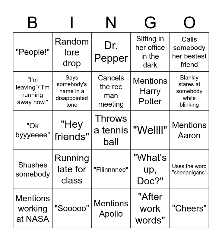 This bingo card has 41 words: Mentions pig farm, "Ok byyyeeee", "What now?", Says somebody's name in a disappointed tone, "Sooooo", "Fiiinnnnee", Cancels the rec man meeting, Uses "..." in a text or discord message, Calls somebody her bestest friend, Shushes somebody, "Hey friends", Sitting in her office in the dark, Throws a tennis ball, Mentions Aaron, "Wellll", Running late for class, In the office past 6:00pm, "People!", Yells "NO!" when asked a question, Dr. Pepper, Uses the word "shenanigans", "Cheers", Mentions Apollo, Mentions Harry Potter, Running late for family dinner, Heavy sigh, "After work words", Says a word then says it louder for dramatic effect, Blankly stares at somebody while blinking, Says something ominous then walks away, Mentions doctorate, Random lore drop, Mentions working at NASA, Uses the word "fabulous", "What's up, Doc?", "I'm leaving"/"I'm running away now.", "Mhm", "We're beefing", "Chick-a-fil-a nug nugs", Mention being cold and "Break!".