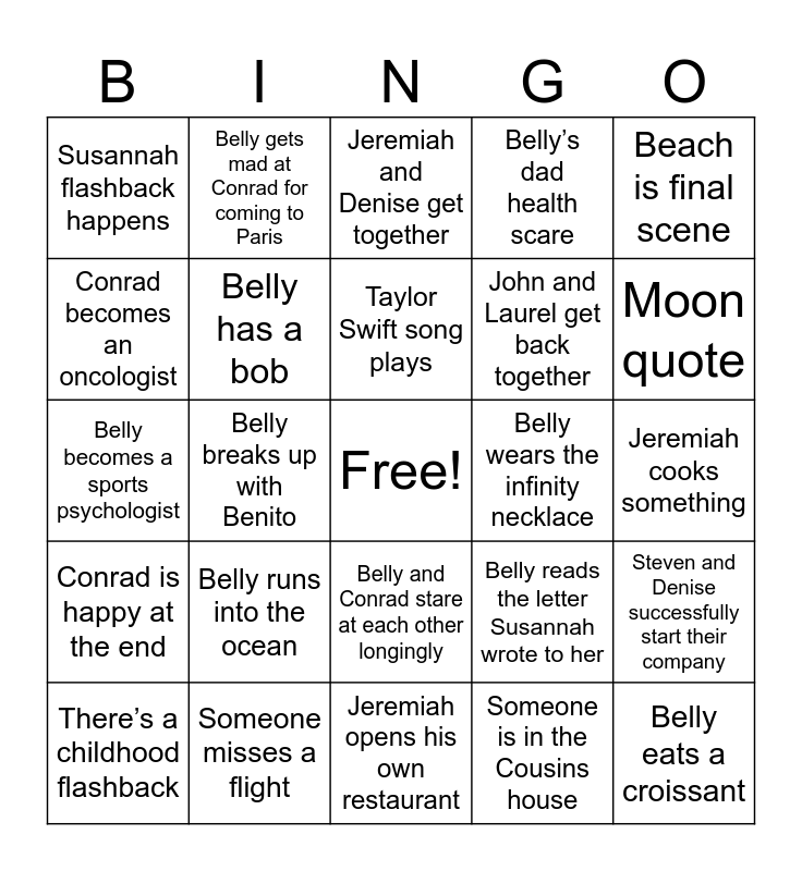 This bingo card has a free space and 24 words: There’s a childhood flashback, Belly runs into the ocean, Taylor Swift song plays, Someone is in the Cousins house, Beach is final scene, Susannah flashback happens, Belly gets mad at Conrad for coming to Paris, Jeremiah and Denise get together, Belly wears the infinity necklace, Jeremiah cooks something, Belly becomes a sports psychologist, Belly has a bob, Belly reads the letter Susannah wrote to her, Steven and Denise successfully start their company, Conrad becomes an oncologist, Someone misses a flight, Jeremiah opens his own restaurant, Belly’s dad health scare, Moon quote, Conrad is happy at the end, Belly breaks up with Benito, Belly and Conrad stare at each other longingly, John and Laurel get back together and Belly eats a croissant.