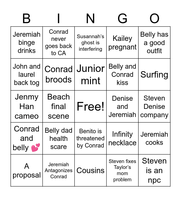 This bingo card has a free space and 24 words: A proposal, Belly dad health scare, Junior mint, Steven fixes Taylor’s mom problem, Belly has a good outfit, Jeremiah binge drinks, Conrad never goes back to CA, Susannah’s ghost is interfering, Denise and Jeremiah, Steven Denise company, Jenmy Han cameo, Conrad broods, Infinity necklace, Jeremiah cooks, John and laurel back tog, Jeremiah Antagonizes Conrad, Cousins, Kailey pregnant, Surfing, Conrad and belly 💕, Beach final scene, Benito is threatened by Conrad, Belly and Conrad kiss and Steven is an npc.
