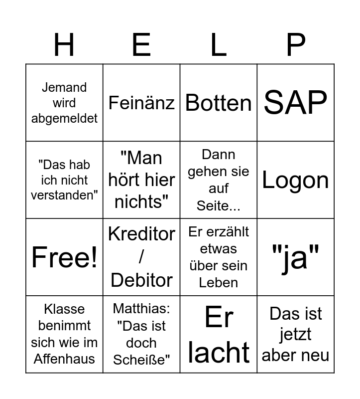 This bingo card has 20 words: "ja", "ne", Botten, Benutzer Icon, Klasse benimmt sich wie im Affenhaus, "Das hab ich nicht verstanden", Matthias: "Das ist doch Scheiße", Jemand wird abgemeldet, Free!, Feinänz, Kreditor / Debitor, Er erzählt etwas über sein Leben, "Man hört hier nichts", Das ist jetzt aber neu, Dann gehen sie auf Seite..., Wenn sie fertig sind gehen sie eine rauchen, Logon, SAP, Er lacht and Bin ich zu schnell / langsam?.
