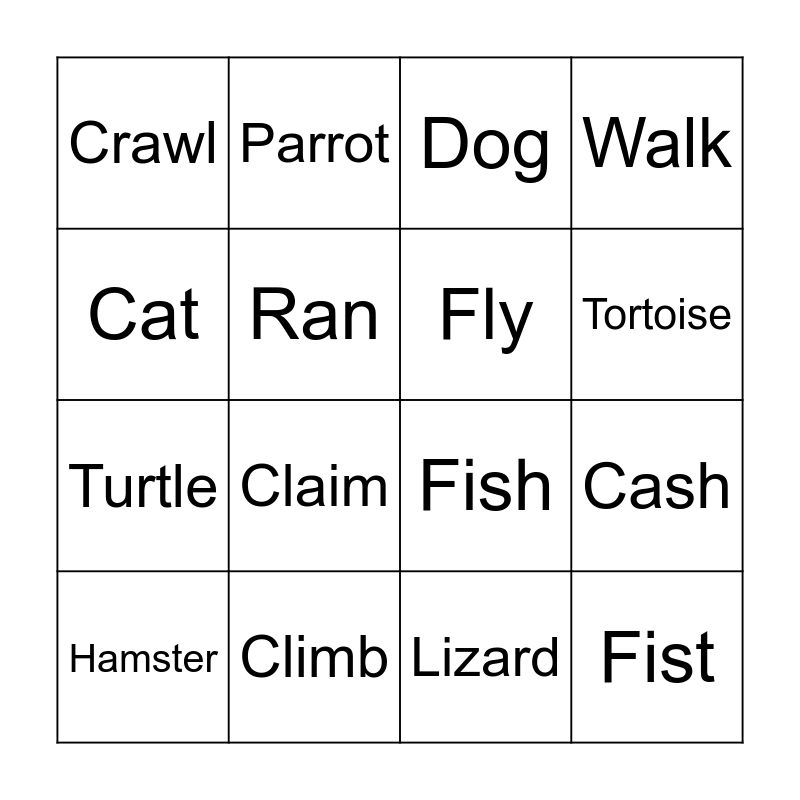 This bingo card has 16 words: Hamster, Climb, Dog, Walk, Cat, Parrot, Fish, Cash, Crawl, Ran, Lizard, Tortoise, Turtle, Claim, Fly and Fist.