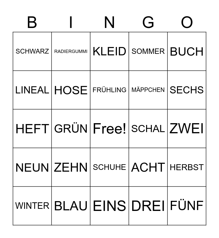 This bingo card has a free space and 30 words: BLAU, ROT, GRÜN, WEISS, SCHWARZ, KLEID, HOSE, SCHUHE, SCHAL, EINS, ZWEI, FÜNF, DREI, VIER, SECHS, SIEBEN, ACHT, NEUN, ZEHN, BUCH, HEFT, BLEISTIFT, RADIERGUMMI, MÄPPCHEN, LINEAL, SOMMER, HERBST, WINTER, FRÜHLING and JAHR.