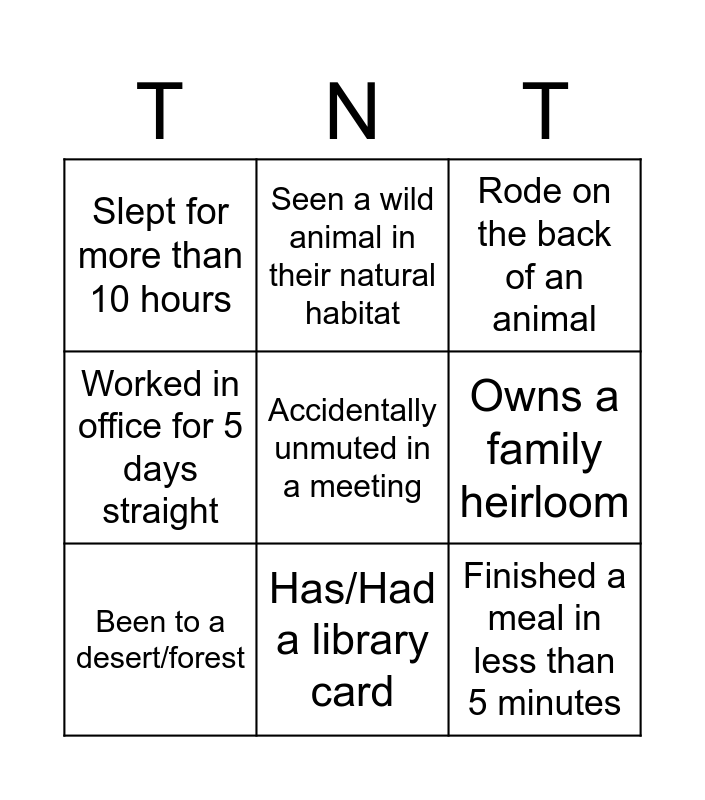 This bingo card has a free space and 17 words: Been on an Overseas Trip, Performed in front of a crowd, Rode on the back of an animal, Slept for more than 10 hours, Seen a movie right before an exam/interview, Worked in office for 5 days straight, Has/Had a pet, Been to a desert/forest, Has/Had a library card, Owns a family heirloom, Met a celebrity, Attended a creative workshop, Finished a meal in less than 5 minutes, Seen a wild animal in their natural habitat, Sent an email to the wrong person, Pretended to understand office jargon I did not know and Goes for a walk everyday.