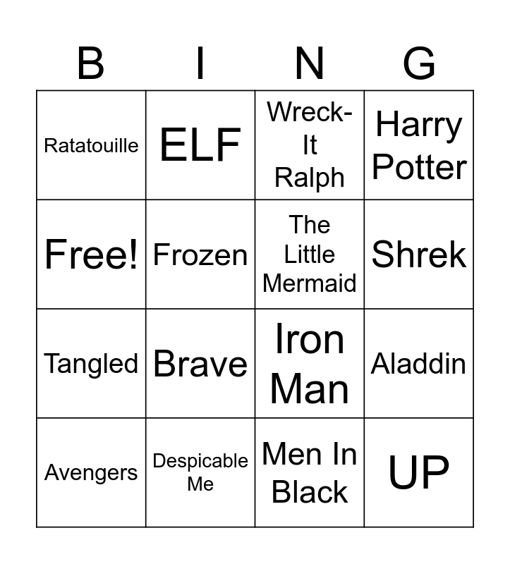 This bingo card has 39 words: The Wizard of Oz, Toy Story, Jaws, The Little Mermaid, Ghostbusters, Wall-E, Shrek, Spider-Man, Free!, UP, Aladdin, Harry Potter, Avengers, Men In Black, Despicable Me, Finding Nemo, Inside Out, Ratatouille, Alice In Wonderland, Guardians of the Galaxy, Frozen, Mulan, Tangled, Brave, ET, The Greatest Showman, Coco, LEGO Movie, Mary Poppins, ELF, Star Wars, The Grinch, Wreck-It Ralph, Forrest Gump, IT, Home Alone, The Karate Kid, Iron Man and Night at the Museum.