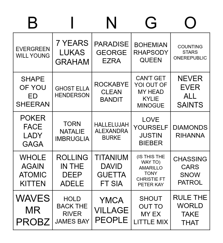 This bingo card has a free space and 24 words: ROLLING IN THE DEEP ADELE, HOLD BACK THE RIVER JAMES BAY, ROCKABYE CLEAN BANDIT, WAVES MR PROBZ, COUNTING STARS ONEREPUBLIC, EVERGREEN WILL YOUNG, SHAPE OF YOU ED SHEERAN, 7 YEARS LUKAS GRAHAM, LOVE YOURSELF JUSTIN BIEBER, TITANIUM DAVID GUETTA FT SIA, CAN'T GET YOI OUT OF MY HEAD KYLIE MINOGUE, POKER FACE LADY GAGA, (IS THIS THE WAY TO) AMARILLO TONY CHRISTIE FT PETER KAY, CHASSING CARS SNOW PATROL, GHOST ELLA HENDERSON, SHOUT OUT TO MY EX LITTLE MIX, DIAMONDS RIHANNA, PARADISE GEORGE EZRA, NEVER EVER ALL SAINTS, TORN NATALIE IMBRUGLIA, RULE THE WORLD TAKE THAT, WHOLE AGAIN ATOMIC KITTEN, BOHEMIAN RHAPSODY QUEEN and YMCA VILLAGE PEOPLE.