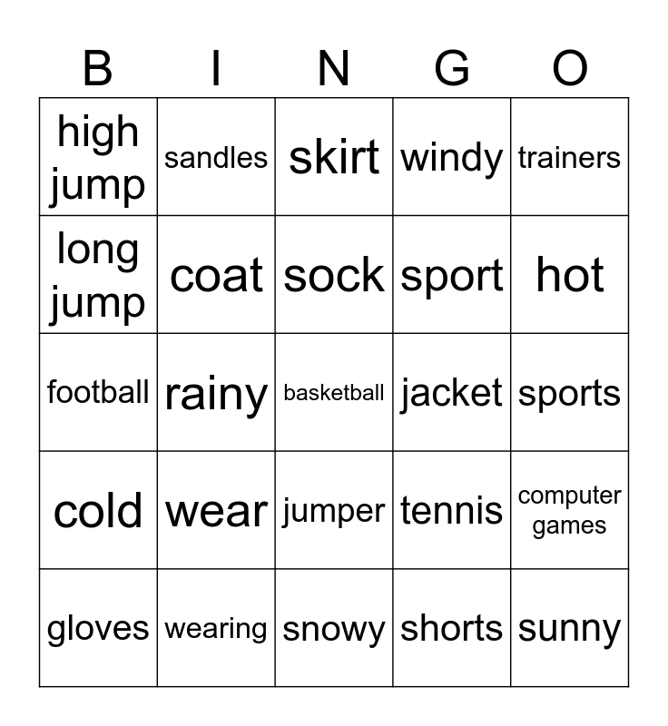 This bingo card has a free space and 24 words: wear, wearing, sock, gloves, trainers, high jump, long jump, sandles, jacket, jumper, sport, football, tennis, computer games, coat, shorts, sports, skirt, hot, rainy, sunny, cold, windy and snowy.