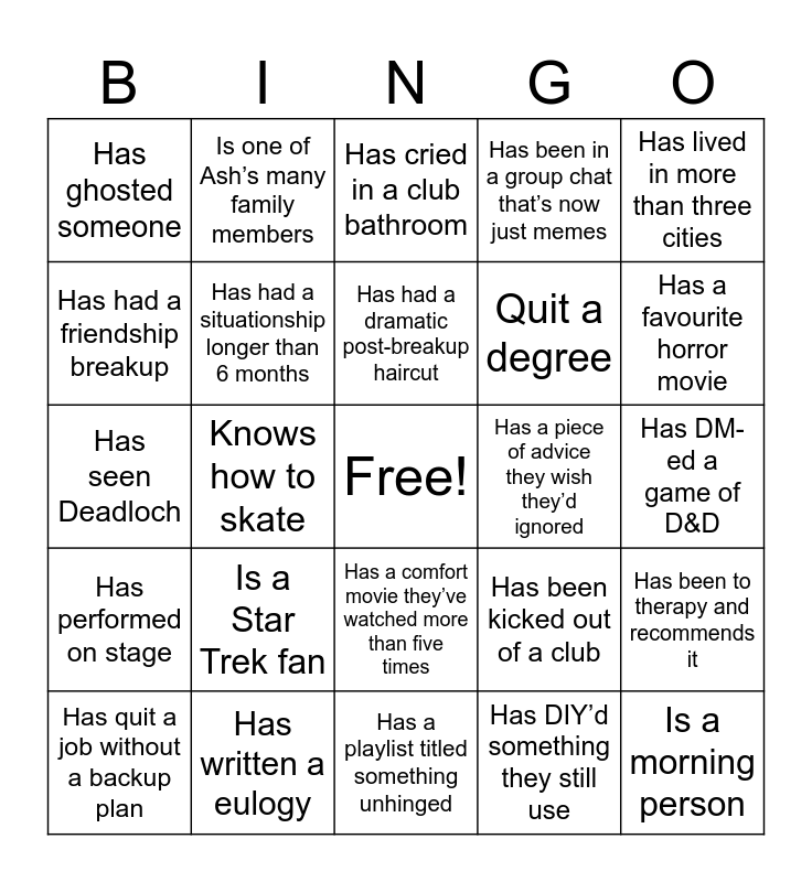 This bingo card has a free space and 61 words: Has done something just for the plot, Has written a eulogy, Is a night owl, Has performed on stage, Has DIY’d something they still use, Has a bucket list item they’ve already ticked off, Has had a situationship longer than 6 months, Finished a degree, Quit a degree, Has a skeleton in their closet—literal or metaphorical, Has been in a group chat that’s now just memes, Has tried (and failed) to keep a plant alive, Has had a friendship breakup, Has a piece of advice they wish they’d followed, Has learned to say “no” without guilt, Has ghosted someone, Is a morning person, Has lived in more than three cities, Has been to a cemetery for fun, Has had a dramatic post-breakup haircut, Has a piece of advice they wish they’d ignored, Has cried in a club bathroom, Has quit a job without a backup plan, Has been to therapy and recommends it, Has a tattoo with a story, Has finally figured out their skincare routine, Has worked a retail or hospitality job, Has a favourite meme about aging, Has a favourite horror movie, Still has two good knees, Has a weird talent or party trick, Has changed careers at least twice, Has seen Fleabag, Has read Gideon the Ninth, Is one of Ash’s many family members, Knows how to sew, Knows how to crochet, Knows how to skate, Has read The Way of Kings, Has seen Deadloch, Has never broken a bone, Is a Star Trek fan, Has DM-ed a game of D&D, Can paint miniatures, Has been kicked out of a club, Has been dumped via text, Has gone on a date just for the story, Has a roommate horror story, Has a meme folder for emotional support, Has a comfort movie they’ve watched more than five times, Has a playlist titled something unhinged, Is a spreadsheet enthusiast, Is a recovering people pleaser, Is a chaos gremlin, Is a burnout survivor, Is a former gifted kid, Is a “text me when you get home” guardian, Could be mistaken for someone still in their early twenties, Has lived in a sharehouse with 5+ people, Could be mistaken for a funeral director and Could be mistaken for a Victorian widow.
