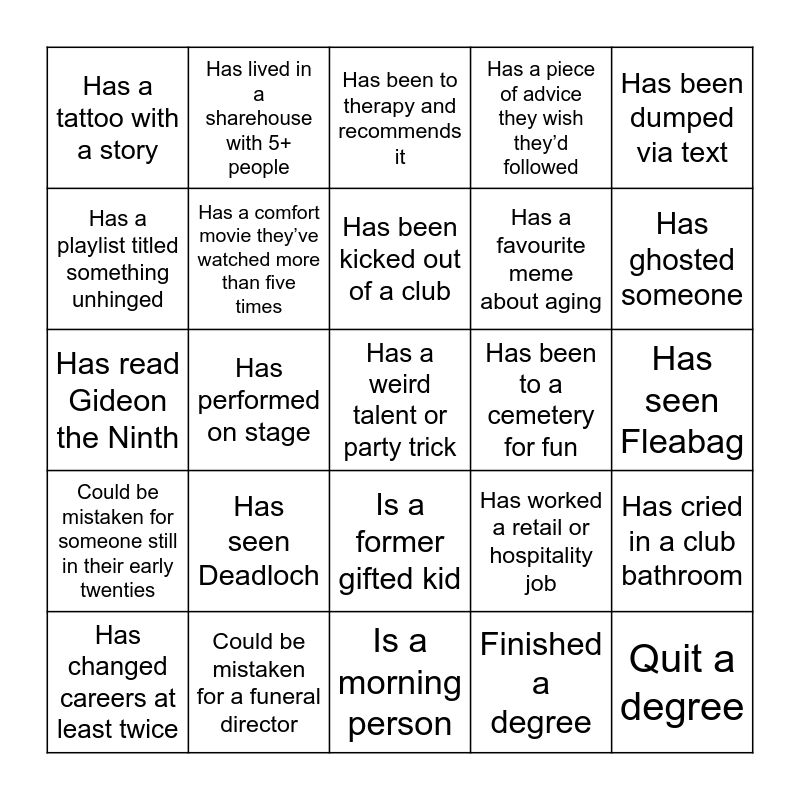 This bingo card has 61 words: Can paint miniatures, Could be mistaken for a funeral director, Could be mistaken for a Victorian widow, Could be mistaken for someone still in their early twenties, Finished a degree, Has a bucket list item they’ve already ticked off, Has a comfort movie they’ve watched more than five times, Has a favourite horror movie, Has a favourite meme about aging, Has a meme folder for emotional support, Has a piece of advice they wish they’d followed, Has a piece of advice they wish they’d ignored, Has a playlist titled something unhinged, Has a roommate horror story, Has a skeleton in their closet—literal or metaphorical, Has a tattoo with a story, Has a weird talent or party trick, Has been dumped via text, Has been in a group chat that’s now just memes, Has been kicked out of a club, Has been to a cemetery for fun, Has been to therapy and recommends it, Has changed careers at least twice, Has cried in a club bathroom, Has DIY’d something they still use, Has DM-ed a game of D&D, Has done something just for the plot, Has finally figured out their skincare routine, Has ghosted someone, Has gone on a date just for the story, Has had a dramatic post-breakup haircut, Has had a friendship breakup, Has had a situationship longer than 6 months, Has learned to say “no” without guilt, Has lived in a sharehouse with 5+ people, Has lived in more than three cities, Has never broken a bone, Has performed on stage, Has quit a job without a backup plan, Has read Gideon the Ninth, Has read The Way of Kings, Has seen Deadloch, Has seen Fleabag, Has tried (and failed) to keep a plant alive, Has worked a retail or hospitality job, Has written a eulogy, Is a “text me when you get home” guardian, Is a burnout survivor, Is a chaos gremlin, Is a former gifted kid, Is a morning person, Is a night owl, Is a recovering people pleaser, Is a spreadsheet enthusiast, Is a Star Trek fan, Is one of Ash’s many family members, Knows how to crochet, Knows how to sew, Knows how to skate, Quit a degree and Still has two good knees.
