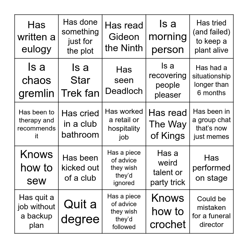 This bingo card has 61 words: Still has two good knees, Quit a degree, Knows how to skate, Knows how to sew, Knows how to crochet, Is one of Ash’s many family members, Is a Star Trek fan, Is a spreadsheet enthusiast, Is a recovering people pleaser, Is a night owl, Is a morning person, Is a former gifted kid, Is a chaos gremlin, Is a burnout survivor, Is a “text me when you get home” guardian, Has written a eulogy, Has worked a retail or hospitality job, Has tried (and failed) to keep a plant alive, Has seen Fleabag, Has seen Deadloch, Has read The Way of Kings, Has read Gideon the Ninth, Has quit a job without a backup plan, Has performed on stage, Has never broken a bone, Has lived in more than three cities, Has lived in a sharehouse with 5+ people, Has learned to say “no” without guilt, Has had a situationship longer than 6 months, Has had a friendship breakup, Has had a dramatic post-breakup haircut, Has gone on a date just for the story, Has ghosted someone, Has finally figured out their skincare routine, Has done something just for the plot, Has DM-ed a game of D&D, Has DIY’d something they still use, Has cried in a club bathroom, Has changed careers at least twice, Has been to therapy and recommends it, Has been to a cemetery for fun, Has been kicked out of a club, Has been in a group chat that’s now just memes, Has been dumped via text, Has a weird talent or party trick, Has a tattoo with a story, Has a skeleton in their closet—literal or metaphorical, Has a roommate horror story, Has a playlist titled something unhinged, Has a piece of advice they wish they’d ignored, Has a piece of advice they wish they’d followed, Has a meme folder for emotional support, Has a favourite meme about aging, Has a favourite horror movie, Has a comfort movie they’ve watched more than five times, Has a bucket list item they’ve already ticked off, Finished a degree, Could be mistaken for someone still in their early twenties, Could be mistaken for a Victorian widow, Could be mistaken for a funeral director and Can paint miniatures.