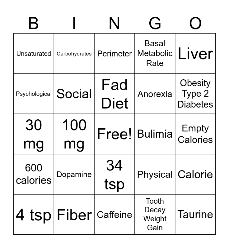 This bingo card has a free space and 24 words: Dopamine, Fiber, Fad Diet, 4 tsp, Liver, Unsaturated, Psychological, Carbohydrates, Bulimia, 34 tsp, Anorexia, 30 mg, Physical, Calorie, Social, Tooth Decay Weight Gain, Empty Calories, Perimeter, Obesity Type 2 Diabetes, 100 mg, Taurine, 600 calories, Basal Metabolic Rate and Caffeine.