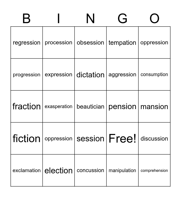 This bingo card has 25 words: oppression, concussion, dictation, exclamation, oppression, regression, progression, procession, pension, session, aggression, fraction, Free!, discussion, expression, comprehension, mansion, obsession, consumption, exasperation, beautician, election, fiction, tempation and manipulation.