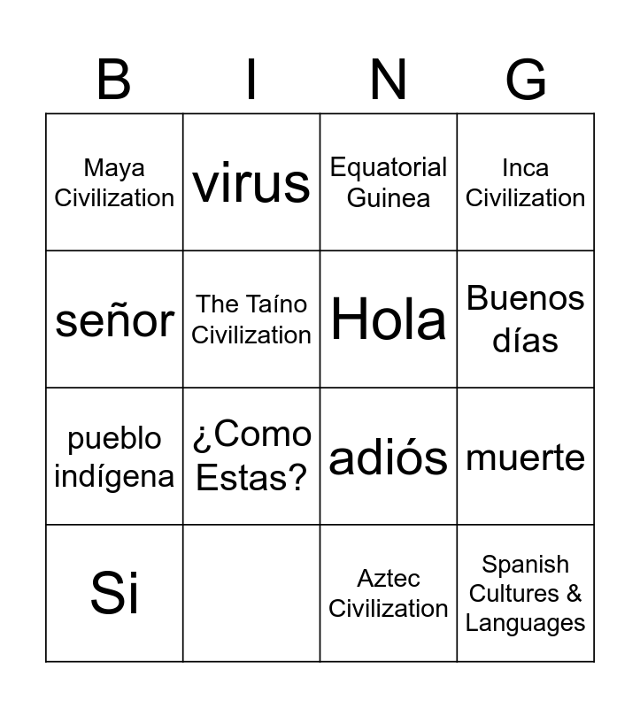 This bingo card has 19 words: Free!, enfermedad, virus, medicina, muerte, pueblo indígena, Aztec Civilization, Inca Civilization, Maya Civilization, The Taíno Civilization, Hola, Buenos días, Si, ¿Como Estas?, adiós, señora, señor, Equatorial Guinea and Spanish Cultures & Languages.