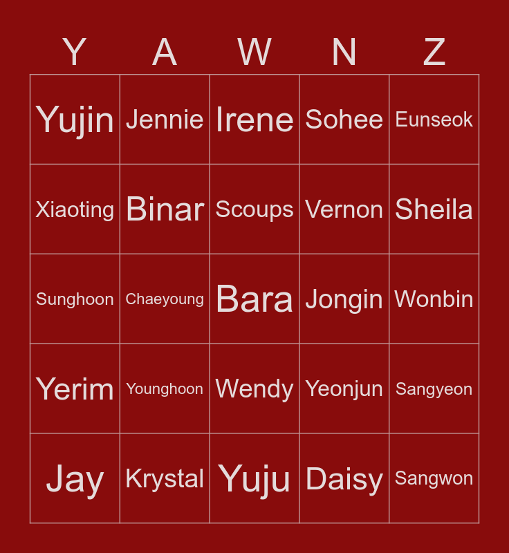 This bingo card has 25 words: Younghoon, Yuju, Scoups, Jay, Eunseok, Yujin, Xiaoting, Jennie, Jongin, Wendy, Vernon, Sunghoon, Yeonjun, Sangyeon, Binar, Sangwon, Wonbin, Irene, Sheila, Chaeyoung, Bara, Krystal, Yerim, Sohee and Daisy.