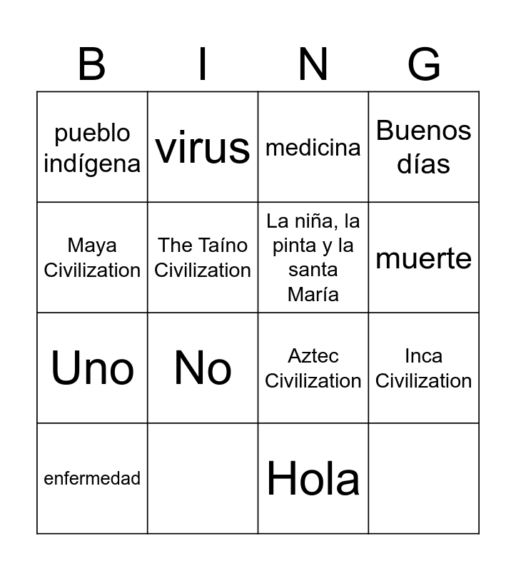 This bingo card has 16 words: Free!, enfermedad, virus, medicina, muerte, pueblo indígena, Aztec Civilization, Inca Civilization, Maya Civilization, The Taíno Civilization, Hola, Buenos días, Uno, No, La niña, la pinta y la santa María and Spanish Cultures & Languages.