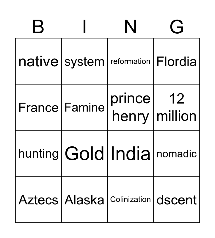 This bingo card has 16 words: Alaska, nomadic, reformation, native, hunting, system, India, Colinization, France, Famine, Aztecs, Flordia, Gold, 12 million, prince henry and dscent.