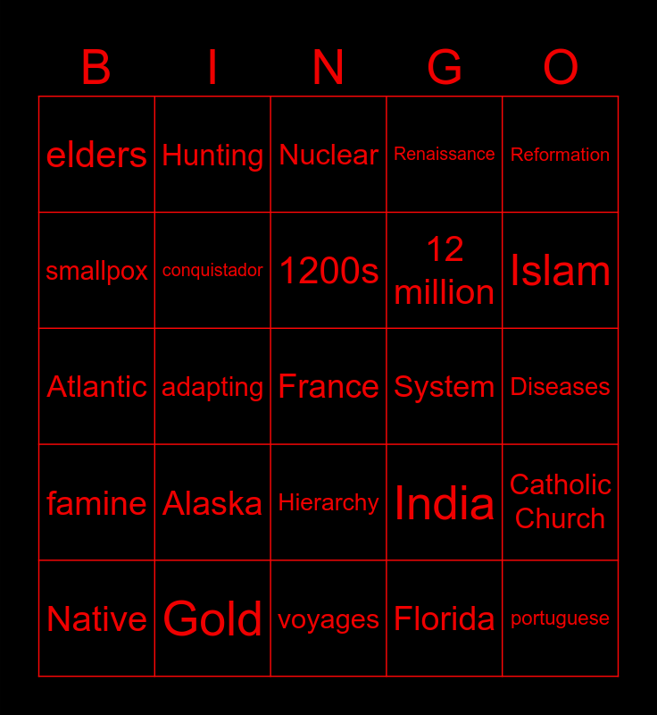 This bingo card has a free space and 24 words: Alaska, Gold, 1200s, Native, Reformation, elders, smallpox, Hunting, System, Hierarchy, 12 million, Atlantic, India, Catholic Church, conquistador, Florida, Diseases, Nuclear, Islam, adapting, portuguese, famine, Renaissance and voyages.