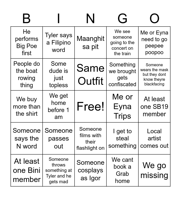 This bingo card has a free space and 24 words: At least one Bini member, Someone passes out, Same Outfit, We cant book a Grab home, Me or Eyna need to go peepee poopoo, He performs Big Poe first, Tyler says a Filipino word, Maanghit sa pit, Me or Eyna Trips, At least one SB19 member, We buy more than the shirt, Some dude is just topless, I get to steal something, Local artist comes out, People do the boat rowing thing, Someone throws something at Tyler and he gets mad, Someone cosplays as Igor, We see someone going to the concert on the train, Someone wears the mask but they dont know theyre blackfacing, Someone says the N word, We get home before 1 am, Someone films with their flashlight on, Something we brought gets confiscated and We go missing.