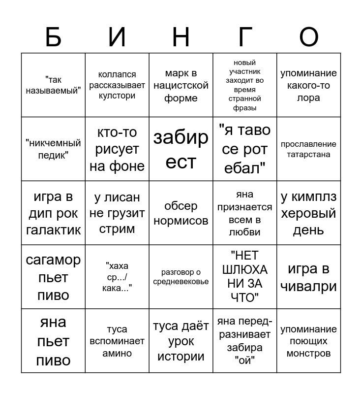 This bingo card has 25 words: "хаха ср.../кака...", туса даёт урок истории, забир ест, яна пьет пиво, упоминание какого-то лора, "так называемый", "никчемный педик", коллапся рассказывает кулстори, яна признается всем в любви, разговор о средневековье, "я таво се рот ебал", игра в дип рок галактик, "НЕТ ШЛЮХА НИ ЗА ЧТО", игра в чивалри, кто-то рисует на фоне, упоминание поющих монстров, у кимплз херовый день, марк в нацистской форме, прославление татарстана, у лисан не грузит стрим, обсер нормисов, туса вспоминает амино, сагамор пьет пиво, новый участник заходит во время странной фразы and яна перед-разнивает забира "ой".