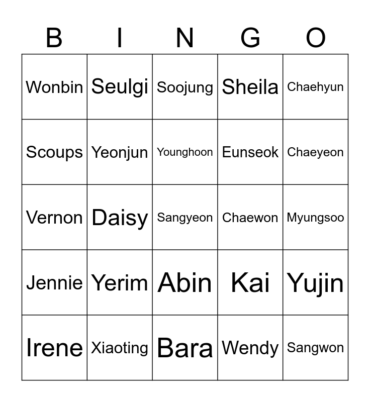 This bingo card has 25 words: Yerim, Bara, Younghoon, Irene, Chaehyun, Wonbin, Scoups, Seulgi, Chaewon, Abin, Eunseok, Vernon, Kai, Yujin, Yeonjun, Sangwon, Myungsoo, Soojung, Chaeyeon, Daisy, Sangyeon, Xiaoting, Jennie, Sheila and Wendy.