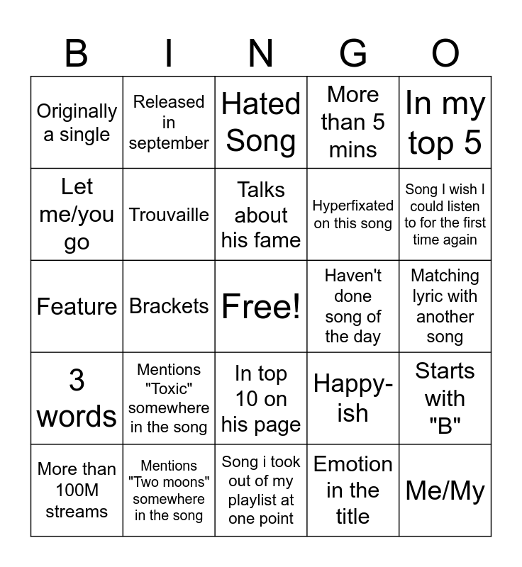 This bingo card has a free space and 24 words: Mentions "Toxic" somewhere in the song, Mentions "Two moons" somewhere in the song, Talks about his fame, More than 100M streams, In my top 5, Originally a single, Let me/you go, Released in september, Haven't done song of the day, In top 10 on his page, Hyperfixated on this song, Feature, Happy-ish, Starts with "B", Trouvaille, Emotion in the title, Matching lyric with another song, Hated Song, Song I wish I could listen to for the first time again, Brackets, Me/My, 3 words, More than 5 mins and Song i took out of my playlist at one point.