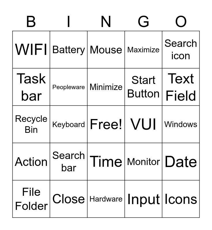 This bingo card has a free space and 31 words: Hardware, Buttons, Keyboard, Software, WIFI, Mouse, Peopleware, Monitor, VUI, Input, Windows, Icons, Output, Password, Text Field, Selection, Date, Search bar, Action, Time, Search icon, Speakers, File Folder, Battery, Start Button, Task bar, Maximize, Recycle Bin, Close, Minimize and Settings.
