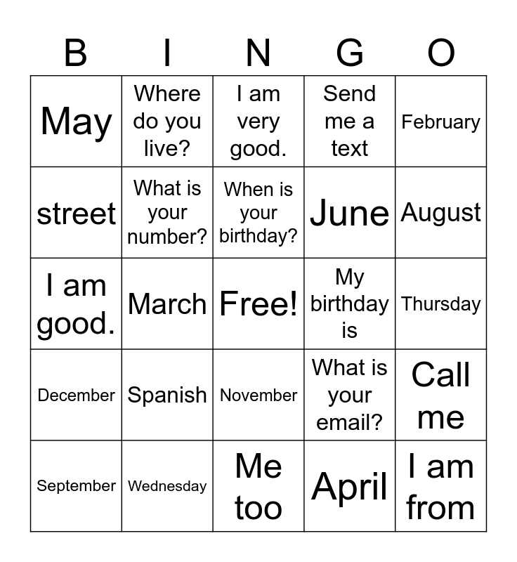 This bingo card has a free space and 47 words: Where are you from?, I am from, the U.S., Me too, Spanish, Mexican, Where do you live?, I live in, street, city, What is your number?, Send me a text, Call me, What is your email?, How old are you?, I am 13 years old., When is your birthday?, My birthday is, January, February, March, April, May, June, July, August, September, October, November, December, Date, Day, Week, Monday, Tuesday, Wednesday, Thursday, Friday, Saturday, Sunday, How are you?, I am very good., I am good., I am ok., I am bad., I am sick. and I am tired..