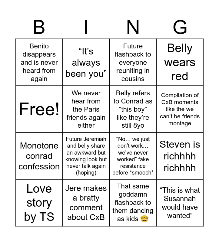 This bingo card has 16 words: Jere makes a bratty comment about CxB, Steven is richhhh richhhh, Future flashback to everyone reuniting in cousins, Benito disappears and is never heard from again, Monotone conrad confession, “It’s always been you”, “No… we just don’t work… we’ve never worked” fake resistance before *smooch*, That same goddamn flashback to them dancing as kids 🤓, Free!, We never hear from the Paris friends again either, Love story by TS, Belly wears red, Future Jeremiah and belly share an awkward but knowing look but never talk again (hoping), Compilation of CxB moments like the we can’t be friends montage, Belly refers to Conrad as “this boy” like they’re still 8yo and “This is what Susannah would have wanted”.