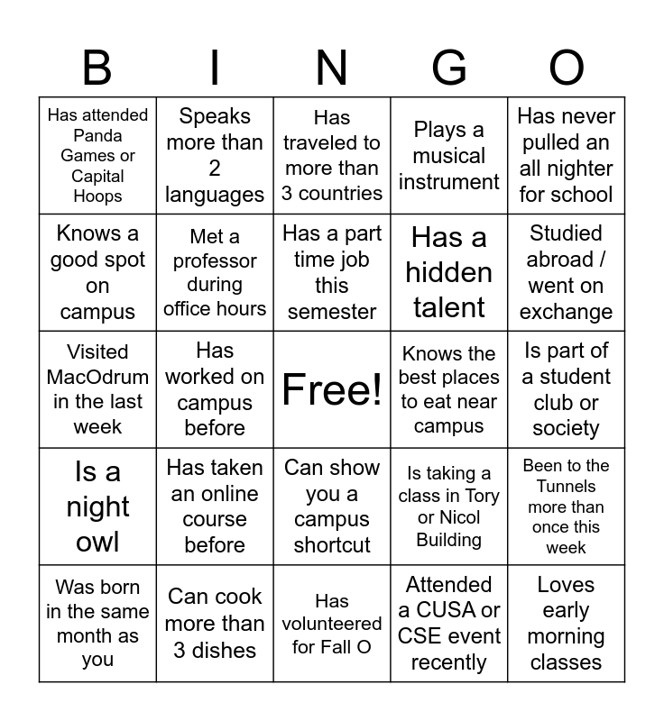 This bingo card has a free space and 24 words: Has taken an online course before, Can cook more than 3 dishes, Has a part time job this semester, Was born in the same month as you, Has never pulled an all nighter for school, Has attended Panda Games or Capital Hoops, Knows a good spot on campus, Speaks more than 2 languages, Knows the best places to eat near campus, Can show you a campus shortcut, Has a hidden talent, Visited MacOdrum in the last week, Is taking a class in Tory or Nicol Building, Been to the Tunnels more than once this week, Met a professor during office hours, Attended a CUSA or CSE event recently, Is part of a student club or society, Has traveled to more than 3 countries, Studied abroad / went on exchange, Has worked on campus before, Loves early morning classes, Is a night owl, Plays a musical instrument and Has volunteered for Fall O.