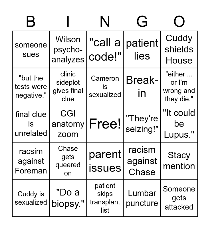 This bingo card has a free space and 24 words: Chase gets queered on, "Do a biopsy.", Cameron is sexualized, Cuddy is sexualized, Cuddy shields House, someone sues, "but the tests were negative.", Wilson psycho-analyzes, "They're seizing!", parent issues, Break-in, final clue is unrelated, racism against Chase, Stacy mention, clinic sideplot gives final clue, Lumbar puncture, "It could be Lupus.", "call a code!", "either ... or I'm wrong and they die.", CGI anatomy zoom, Someone gets attacked, racsim against Foreman, patient lies and patient skips transplant list.