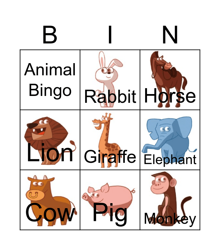 This bingo card has 8 images and 9 words: Cow, Horse, Rabbit, Lion, Animal Bingo, Elephant, Giraffe, Monkey and Pig.