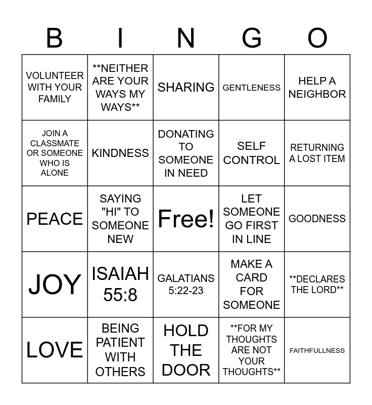 This bingo card has a free space and 24 words: ISAIAH 55:8, BEING PATIENT WITH OTHERS, DONATING TO SOMEONE IN NEED, LOVE, HELP A NEIGHBOR, VOLUNTEER WITH YOUR FAMILY, JOIN A CLASSMATE OR SOMEONE WHO IS ALONE, **NEITHER ARE YOUR WAYS MY WAYS**, LET SOMEONE GO FIRST IN LINE, GALATIANS 5:22-23, SELF CONTROL, PEACE, MAKE A CARD FOR SOMEONE, **DECLARES THE LORD**, KINDNESS, **FOR MY THOUGHTS ARE NOT YOUR THOUGHTS**, GOODNESS, SHARING, RETURNING A LOST ITEM, SAYING "HI" TO SOMEONE NEW, FAITHFULLNESS, JOY, GENTLENESS and HOLD THE DOOR.