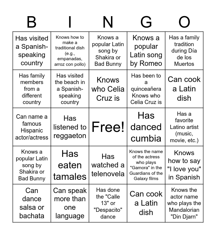 This bingo card has a free space and 24 words: Has eaten tamales, Can speak more than one language, Knows who Celia Cruz is, Can dance salsa or bachata, Has a family tradition during Día de los Muertos, Has visited a Spanish-speaking country, Has family members from a different country, Knows how to make a traditional dish (e.g., empanadas, arroz con pollo), Has danced cumbia, Has watched a telenovela, Has been to a quinceañera Knows who Celia Cruz is, Can name a famous Hispanic actor/actress, Knows the name of the actress who plays "Gamora" in the Guardians of the Galaxy films, Knows how to say "I love you" in Spanish, Has visited the beach in a Spanish-speaking country, Can cook a Latin dish, Has a favorite Latino artist (music, movie, etc.), Knows a popular Latin song by Shakira or Bad Bunny, Can cook a Latin dish, Has listened to reggaeton, Knows the actor name who plays the Mandalorian "Din Djarn", Knows a popular Latin song by Shakira or Bad Bunny, Knows a popular Latin song by Romeo and Has done the "Calle 13" or "Despacito" dance.